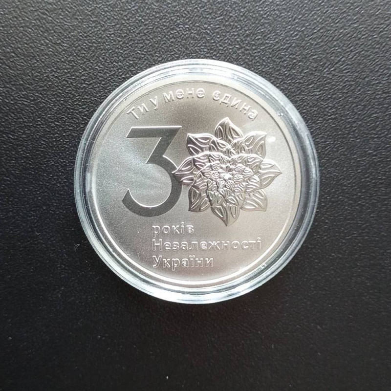 На реверсі ми бачимо символіку Дня незалежності – цифру 3 та стилізовану цифру 0 у вигляді квітки. А написи навколо неї... "ТИ У МЕНЕ ЄДИНА", "РОКІВ НЕЗАЛЕЖНОСТІ УКРАЇНИ" не залишить байдужим до такого вишуканого виконання.