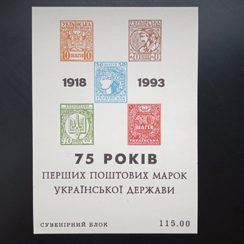 Блок надрукований на цупкому папері і немає клейової основи. На блоці зображені перші українські марки «Шаги» та надрукований надпис «75 років поштових марок Української держави». Також на лицьовій стороні зазначений номінал 115 карбованців. Кошти від продажу блоку збирались для потреб київського клубу філателістів. Розповсюджувався сувенір у вузькому колі серед київських філателістів та на філателістичний виставці 1993 року серед колекціонерів. Точна кількість надрукованих блоків невідома. Предмет колекціонування друкувався на київському комбінаті «Поліграфія» і на свій час мав доволі актуальний та якісно зроблений зовнішній вигляд. Активну участь у розробці та формуванні цього любительського випуску взяв Михайло Сидій - активний член київської спілки філателістів.