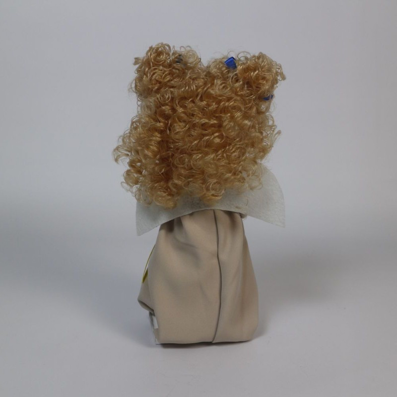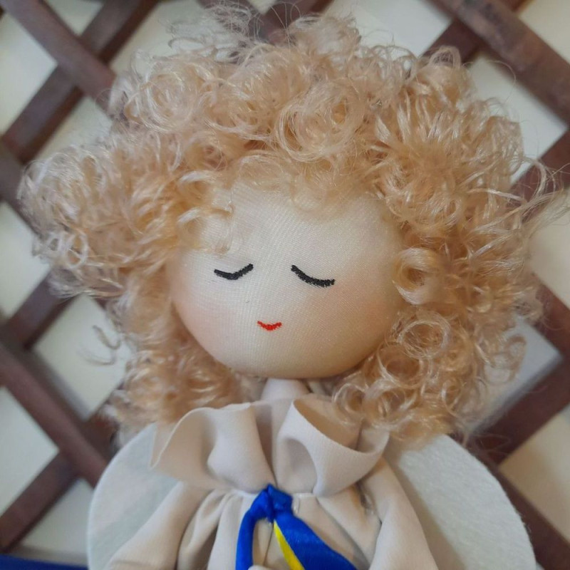 Кожна деталь – це тепло рук, що створили диво. Лялька виготовлена вручну зі змішаних матеріалів – переважно з тканини, що додає їй особливої м’якості та домашнього затишку. Завдяки зручному формату (висота 28 см) ангела можна розмістити будь-де: на підвіконні, тумбі, письмовому столі, біля ікони чи дзеркала, або навіть у дорозі — в салоні авто.
