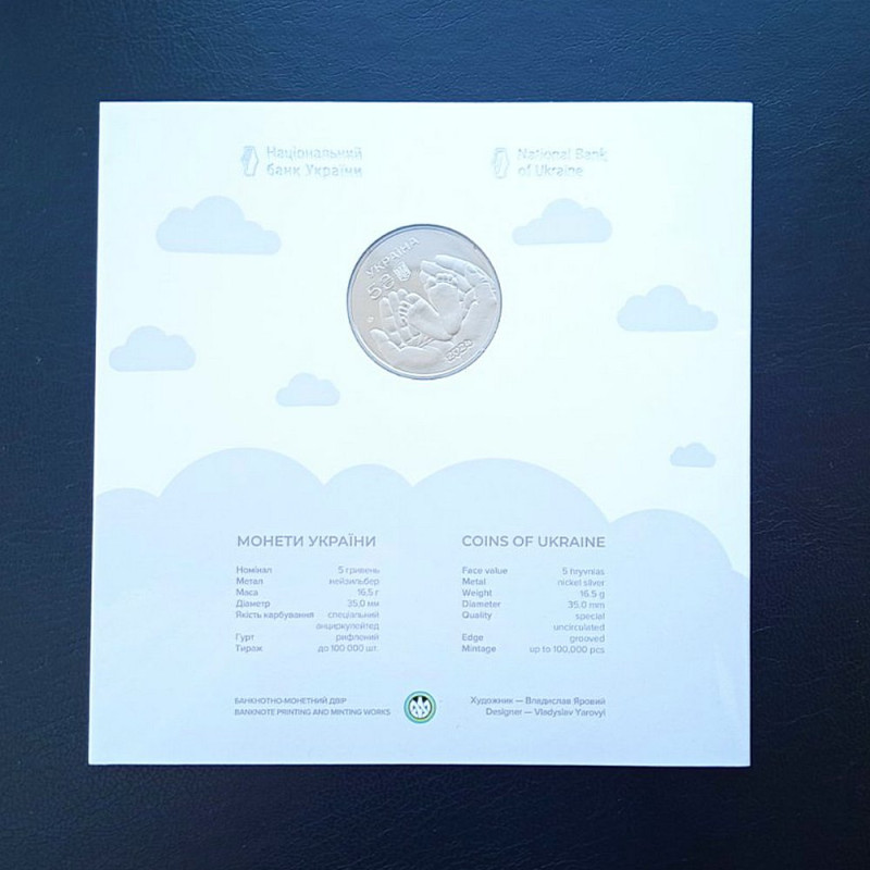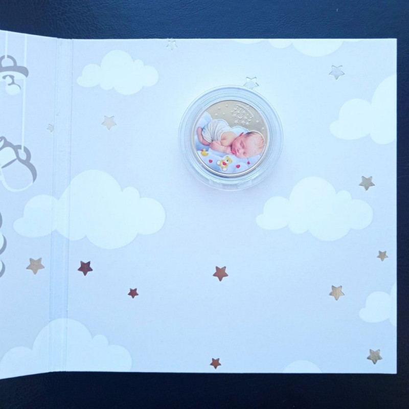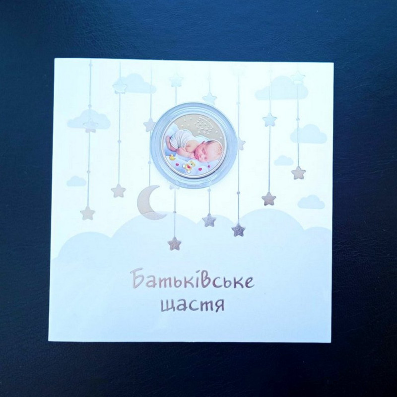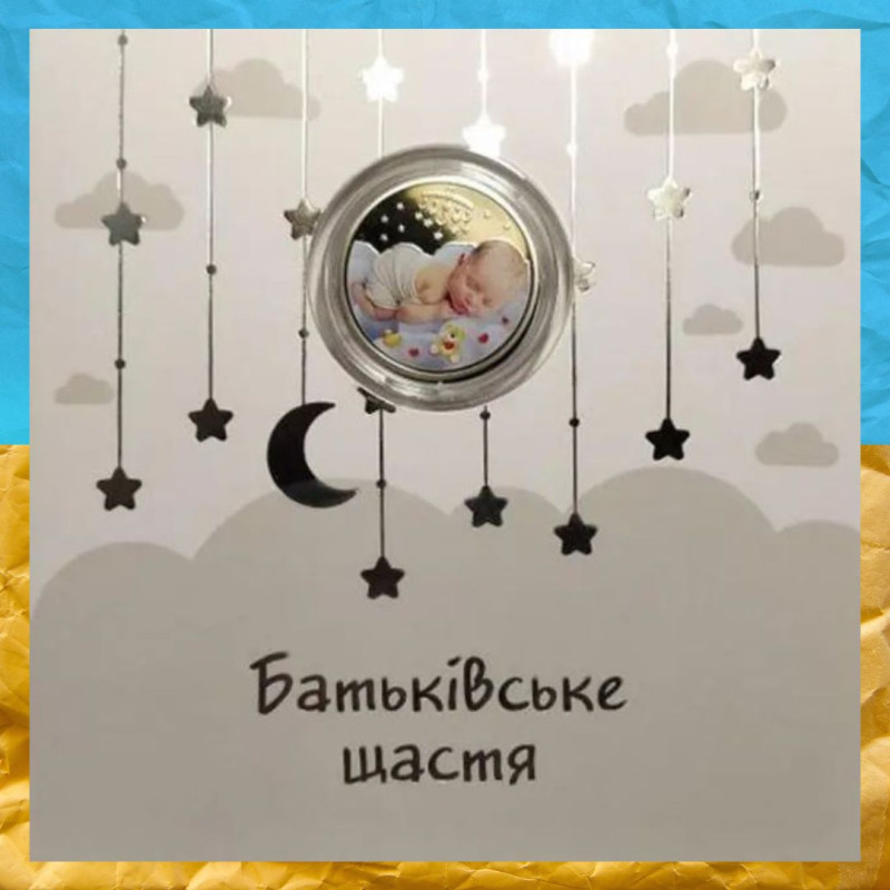 Ця монета – не просто шматок металу, а щось більше. Це цілий всесвіт, утілений у символах, що промовляє до серця й викликає найглибші емоції. Ідеальний подарунок для батьків, які щойно вперше взяли на руки своє дитя, – цей витвір наповнений символікою, а його теплий, лагідний дизайн пробуджує почуття безмежного щастя. Монета оздоблена яскравим тамподруком, що підкреслює її деталі, і дбайливо вкладена в барвисту листівку-пакування, де залишено місце для щирих побажань новонародженому. Це не просто пам’ятний знак, а справжній оберіг, що зберігатиме любов і тепло протягом багатьох років.