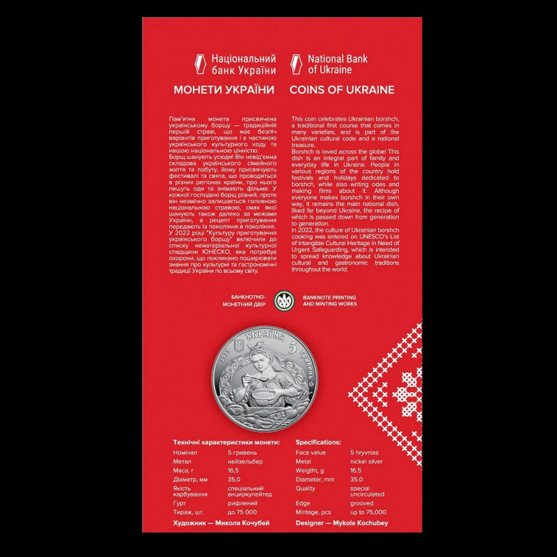Монета «Борщ» — це не просто витвір нумізматичного мистецтва, а справжній символ душі українського народу, втілений у металі. Вона відображає неперевершену естетику та дух національної кухні, яка віками формувала унікальну українську культуру. У червоному сувенірному пакуванні, яке відразу привертає увагу своєю яскравістю, монета стане справжньою окрасою будь-якої колекції або пам’ятним подарунком.