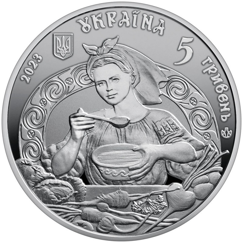 На аверсі зображено господиню під час приготування борщу біля традиційної печі, що символізує тепло, затишок та безперервність родинного життя. Орнамент, виконаний у трипільських мотивах, підкреслює древність цієї кулінарної традиції, яка передавалася з покоління в покоління, як священна наука. Малий Державний Герб України вінчає композицію, наголошуючи на її національній важливості.