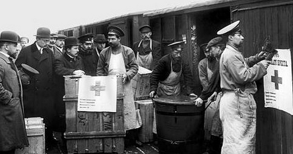 Розвантаження допомоги від Червогого Хреста початок 20 століття. Фото сайт УЧХ