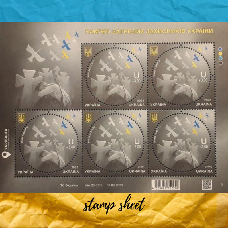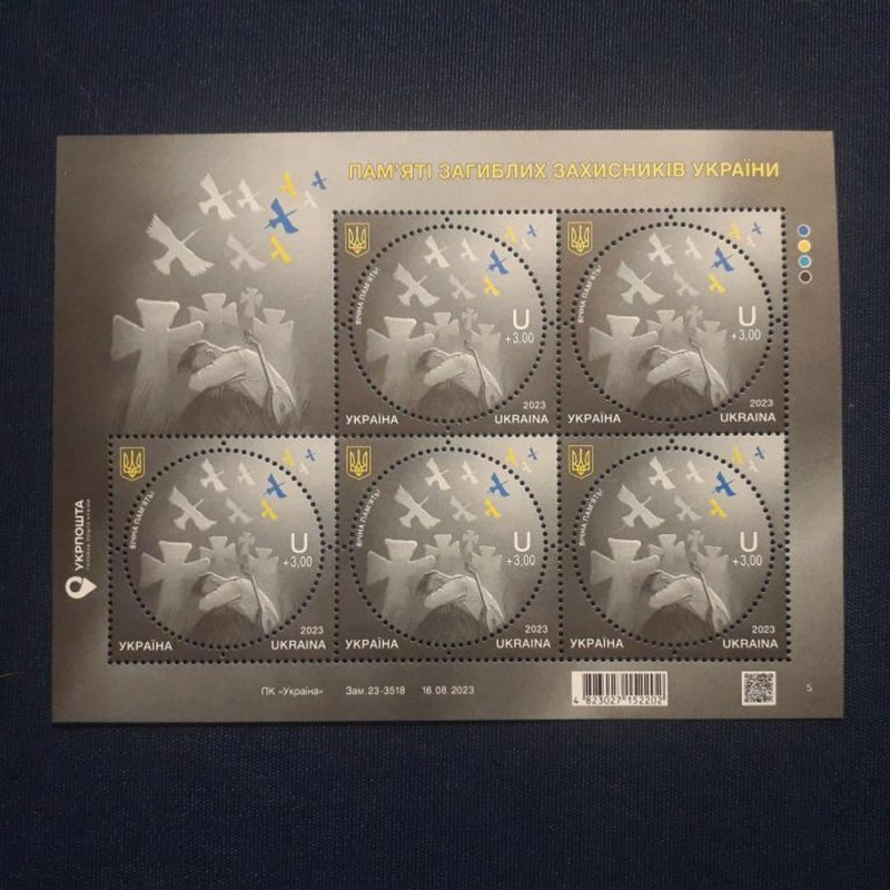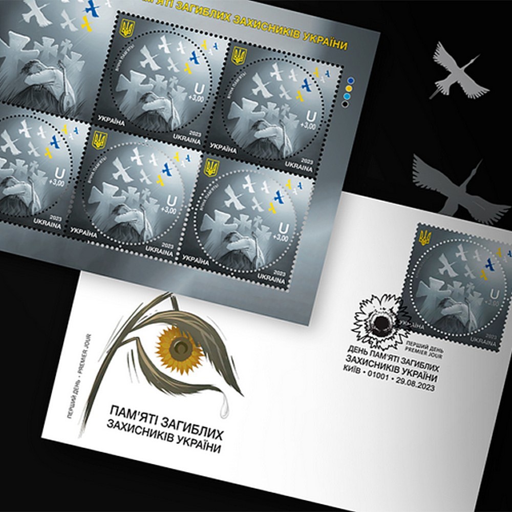 Поштова марки День пам’яті загиблих захисників України введена до обігу 29 серпня 2023 року. Ця мініатюра присвячена усім воїнам Української незалежної держави, що поклали своє життя у нерівній боротьбі із ворогом.