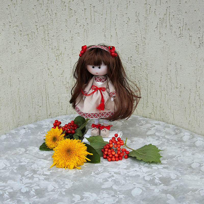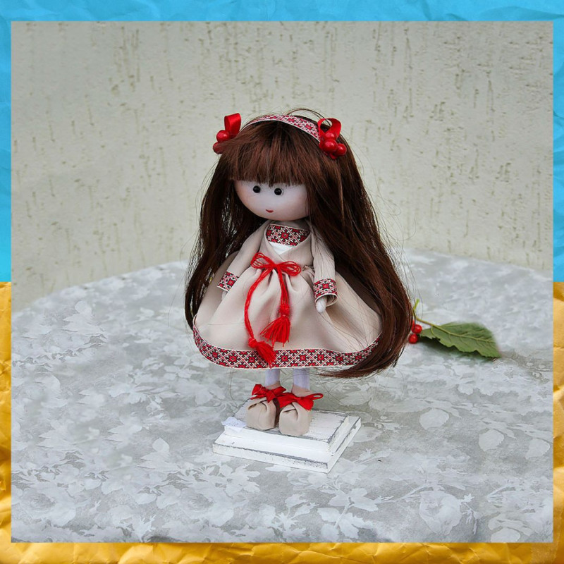 На ляльці— вишиваночка у біло-червоних тонах, з автентичним орнаментом, що нагадує про давні ремесла й родинну пам’ять. У дівчинки темне волосся, заплетене в довгі коси, оздоблені стрічками — образ, що втілює ніжність і вроду української дівчини. Личко ляльки — охайне, миле, з уважно проробленими деталями. А ще — волосся можна розчісувати, що робить цю іграшку ще приємнішою у спілкуванні.