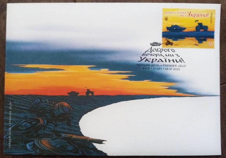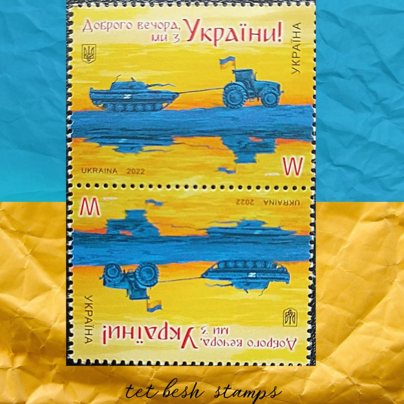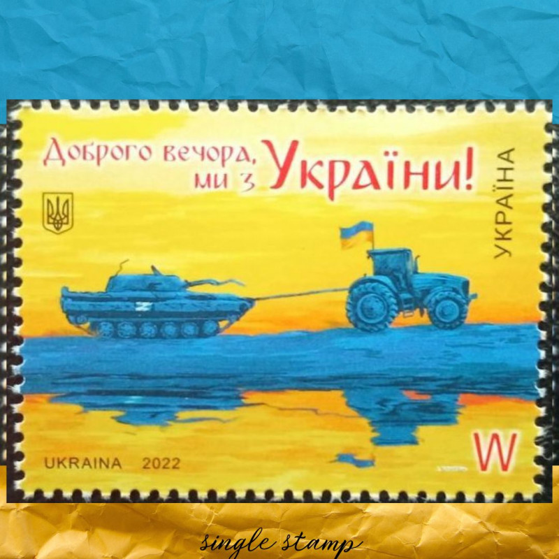 Марка "Доброго вечора, ми з України!", яка вийшла 28 липня, має реальну передісторію, яка трапилась на Миколаївщині, та згодом все частіше повторювалась по всіх містах, де ведуться активні бойові дії. Українські трактористи вкрали танк, який покинули окупанти під час активного наступу Збройних Сил України. Ситуація одразу набула комічного відтінку і водночас мала символічне значення для кожного українця - ми усі робимо великий вклад у спільну перемогу, кожен власними силами та ресурсами.