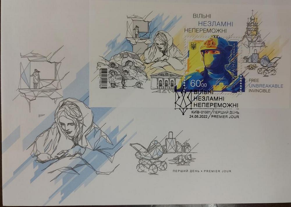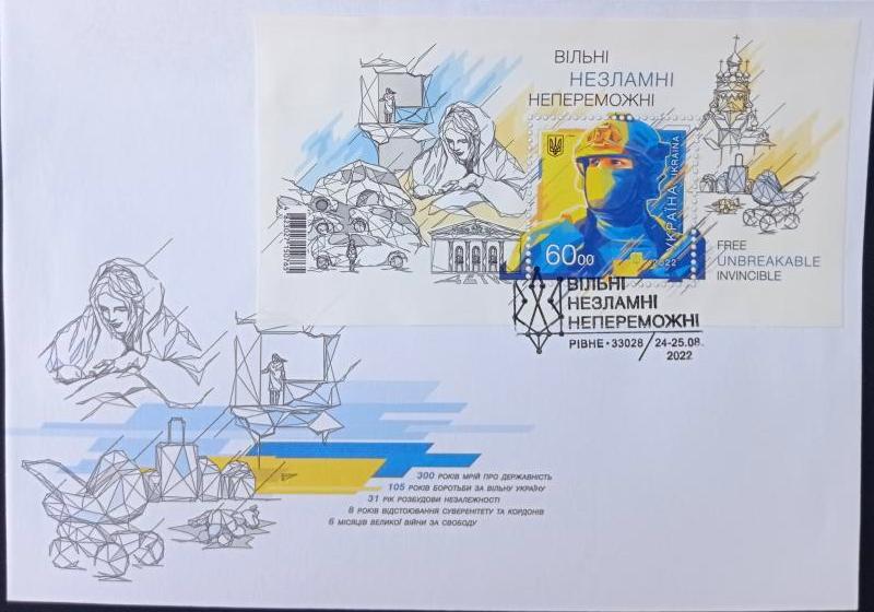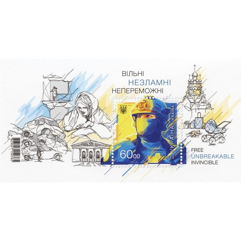 The color scheme of the postal block is also symbolic, as they are made in the style of graphics. The lives of people under occupation, in the conditions of war, lost their colors, became as black and white as the stamps from the "FREE. UNBREAKABLE. INVINCIBLE" block. However, all Ukrainians have hope for blue-yellow colors, which will soon be in every corner of our land - native free Ukraine.