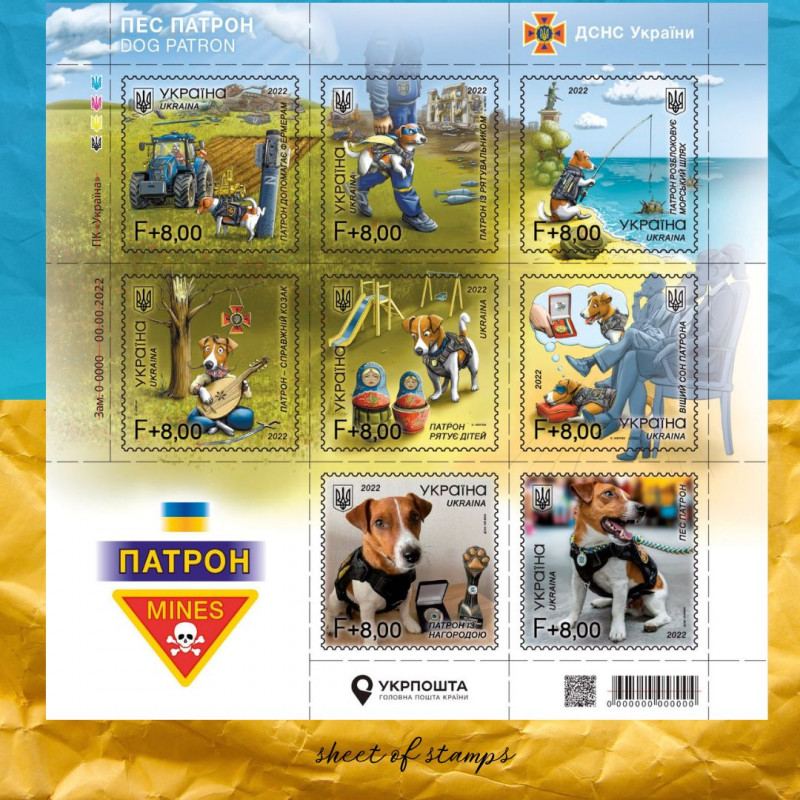 The patron saint is a favorite of children from all over Ukraine. This dog became so famous that Ukrposhta dedicated a whole sheet of postage stamps to him. This dog was rescued from the seventh floor of a destroyed building during the shelling of Chernigov. The dog stayed with the rescuers and began to help them in the search for explosive objects. The patron dog is depicted in many works of art and a dedicated musical composition. Patron gained particular popularity during special conversations with children about the dangers of unfamiliar objects. Usually, employees of the state demining service took their pet to such conversations. This is how the dog became famous.