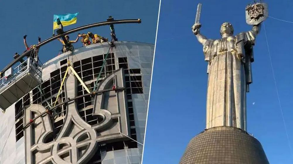 Replacing the coat of arms on the monument "Motherland" Photo 24 channel
