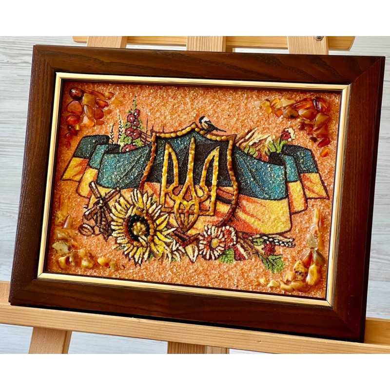 Картина з бурштину "Герб України" — це не просто мистецтво, це глибокий акт, що прокладає шлях у серце справжньої української душі. Вона переносить вас в інший світ, наповнений гордістю за свою країну і шаною до її історії. Тут, у центрі, височіє герб України, могутній символ свободи, незалежності й незламності українського народу. Цей герб, обрамлений природними мотивами, переплітається у витонченому танці з колоссям, листям та квітами. Це все створює атмосферу затишку, тепла і, водночас, сили.