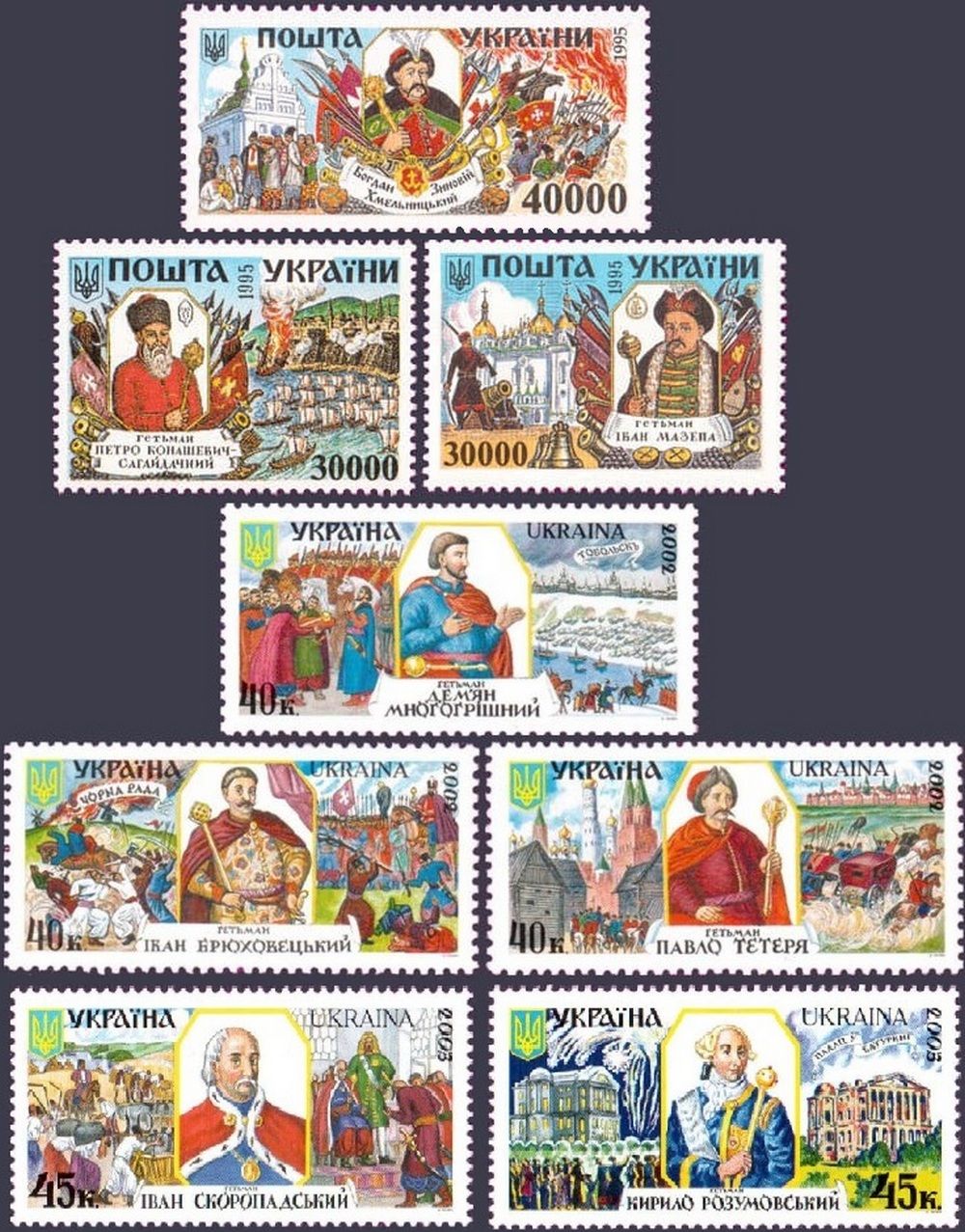 Гетьмани України серія марок 1995 рік (Мазепа, Сагайдачний, Хмельницький )У 1995 році Україна випустила вражаючу серію поштових марок, присвячених трем видатним гетьманам – Івану Мазепі, Петру К..