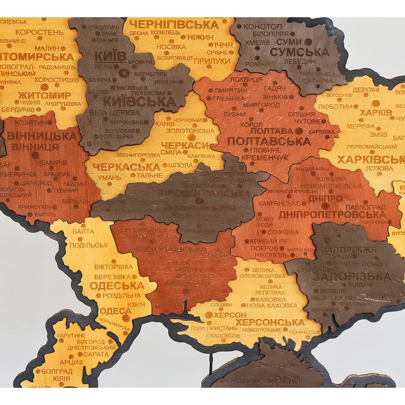 Настінна карта України – це витвір мистецтва, створений українськими майстрами з любов’ю та турботою. Виготовлена з натурального дерева, вона є не лише естетично привабливою, але й екологічною. Ця дерев'яна карта України на стіну виготовлена з високоякісної фанери липи та берези, що робить її довговічною та приємною на дотик. Кожна область України ретельно вирізана та забарвлена різними відтінками коричневого кольору, що додає карті особливої вишуканості та рельєфності.