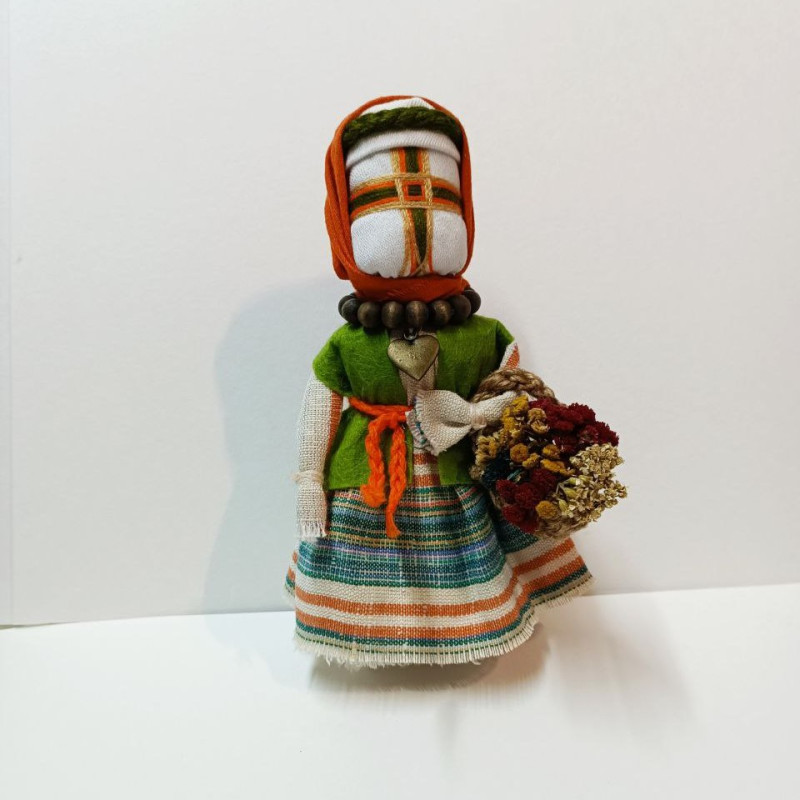 Вбрання — автентичне і глибоко символічне. У спідниці — візерунки, що відображають традиційні орнаменти, в голові — хустка, міцно зав’язана, як знак жіночої мудрості та сили. Лиця мотанка не має — аби вберегти її енергію, не дозволяючи злим духам оселитися у ній. Замість обличчя — хрест-оберіг, що поєднує чотири сторони світу, чотири стихії, гармонію життя.