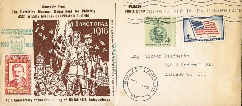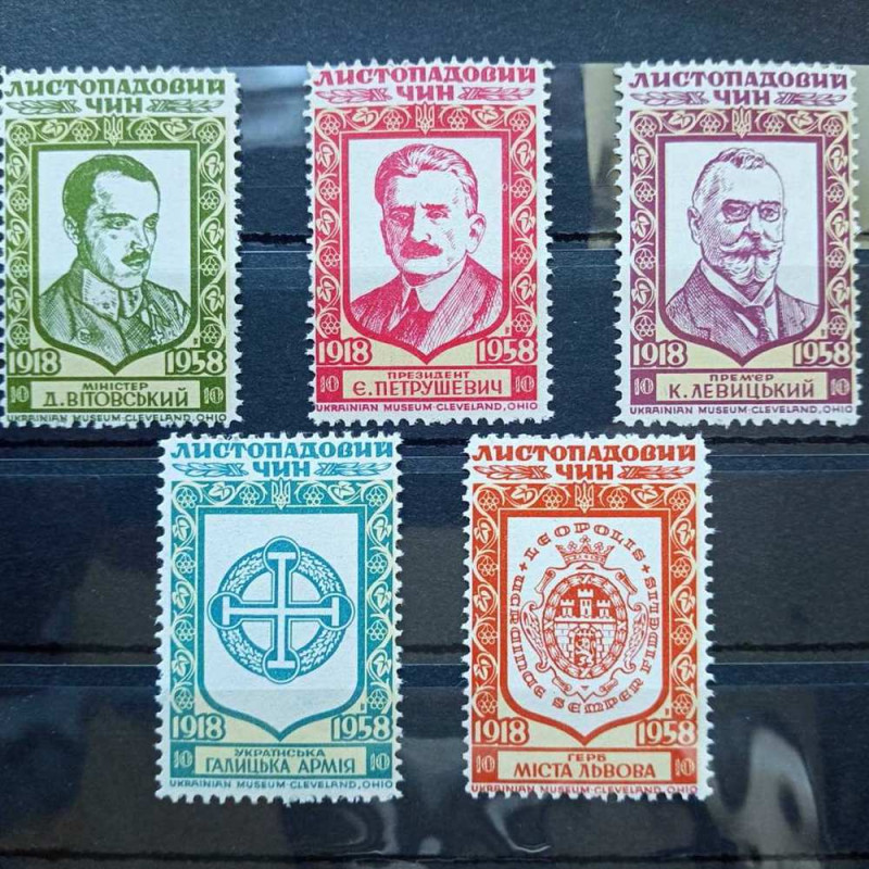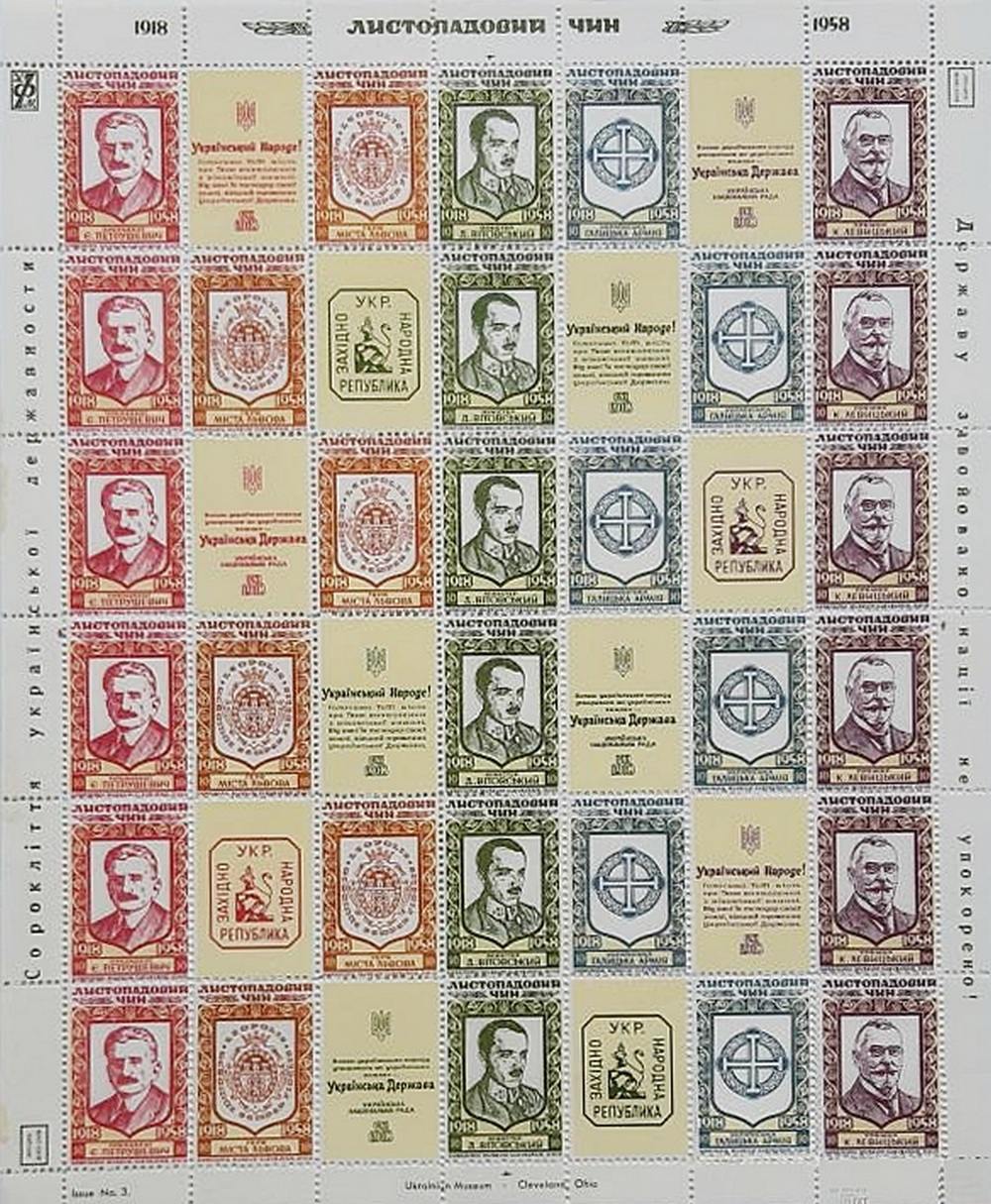 самого низу маленькими буквами зазначено «Ukrainian Museum Cleveland, Ohio». На марках изображено члени уряду ЗУНР та герби УГА та міста Львів :