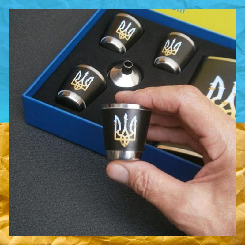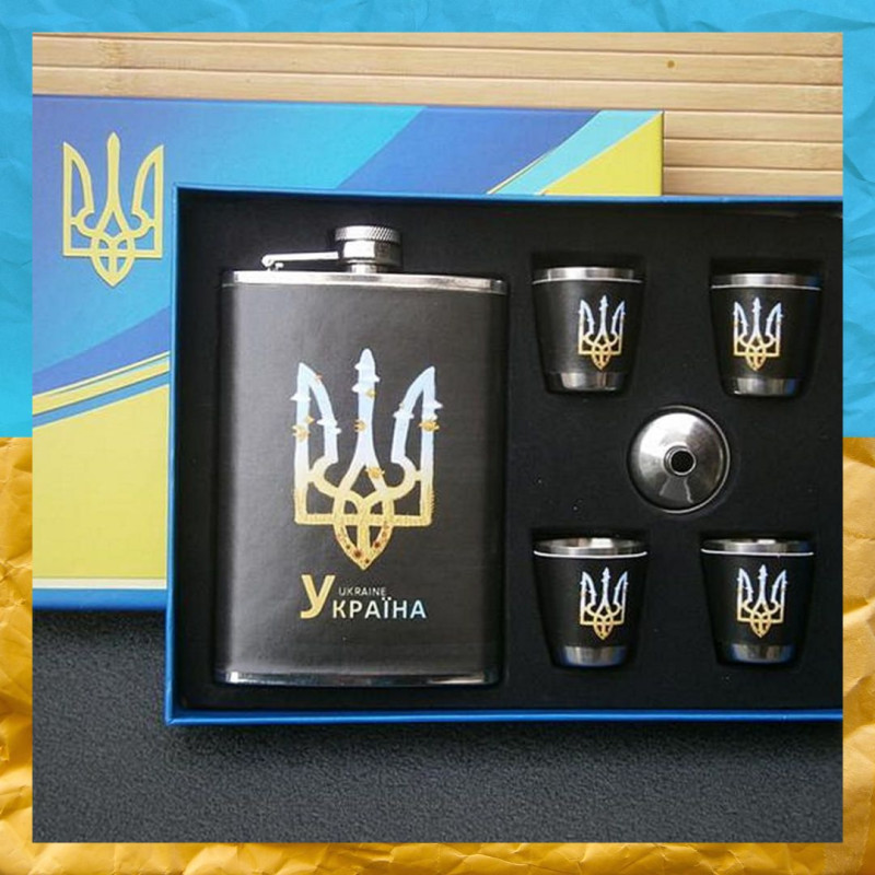 Подарунковий набір у патріотичному українському стилі 6 в 1: фляга 270 мл, 4 чарки та лійка. Фляга та чарки оформлені з темним фоном і прикрашені жовто-блакитним зображенням Герба України — стильне поєднання символіки та дизайну. Це оригінальний сувенір з українською символікою, який поєднує естетику та функціональність.