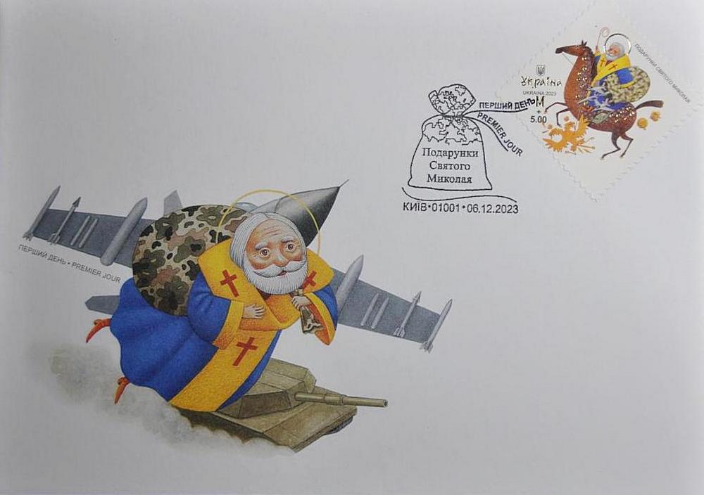 У 2023 році цей день святкується 6 грудня. На цю дату також припадає інше державне свято - день Збройних Сил України. Саме тому тематика війни та арміїї присутня на цьому поштовому випуску.