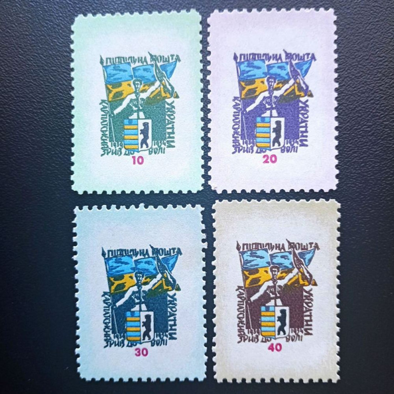 Надпис на марках проголошує: "Карпатський зрив до волі України" та дату "1939-1954", що підкреслює історичну значущість моменту. Номінали марок становлять 10, 20, 30 та 40 шагів, що робить їх доступними для широкого кола колекціонерів.