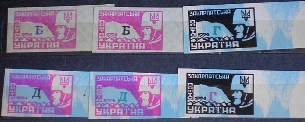 Відомо два варіанта ужгородського випуску 1994. Існують марки без номіналів і марки з буквеними номіналами.