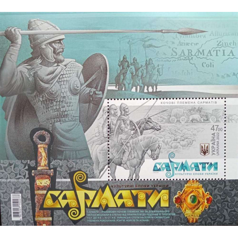 Надписи зосереджені з правої частини марки. Внизу назва марки стилізованим шрифтом «Сармати» та під нею невеликим розміром «КУЛЬТУРНІ ЕПОХИ УКРАЇНИ» та зовсім дрібно ініціали авторів. Зверху опис «КОЧОВІ ПЛЕМЕНА САРМАТІВ». Правий крає має вертикально орієнтовані надписи «УКРАЇНА» та «UKRAINA 2022». Відповідно до орієнтації марки зображено тризуб та номінал.