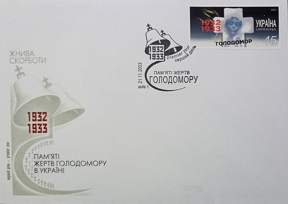 Скорботна марка випущена у річницю трагічної події вшановує пам'ять усіх загиблих і ненароджених українців в наслідок цих жахливих подій. Марка має символічне значення для українців. Мініатюра виконана в темних тонах. На марці зображений надгробний хрест з символічним обличчям матері. Дуже символічним є зображення колосків пшениці, що символізує жорстокі радянські закони, згідно яких селяни були позбавлені усього урожаю і не могли залишити собі навіть жодного колоска пшениці. Знизу марки чорними буквами виведено слово "голодомор", у лівій частині кривао-червоним зазаначено дату трагічної події 1932-1933. Художник ескізу -Т. Лавро. До марки впроваджений спеціальний конверт та затверджено відповідний штамп.