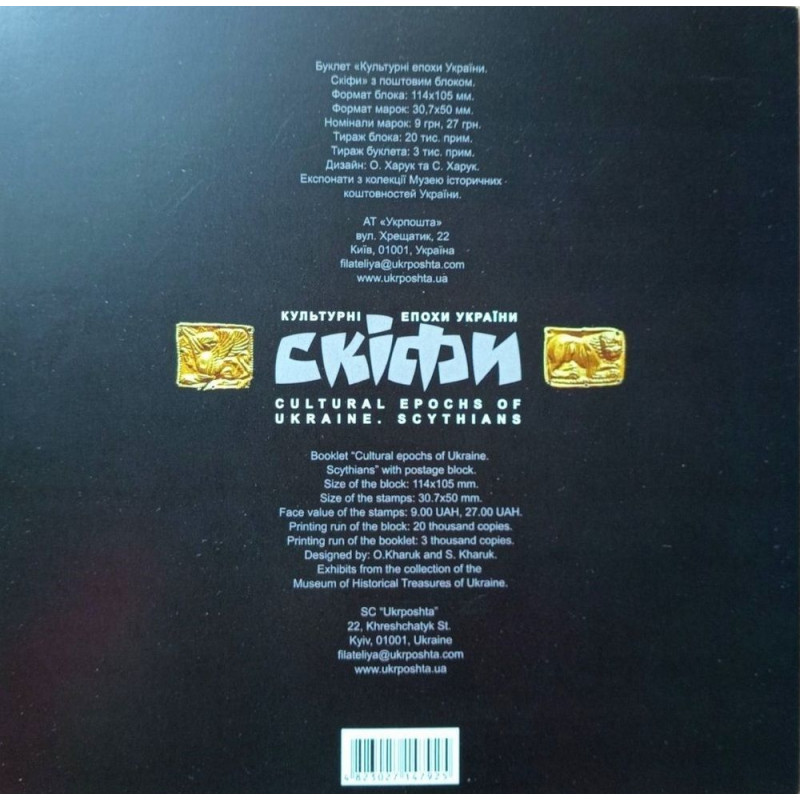 Сувенірний буклет виконаний під стиль блоку. Але вирізняє його більш яскравий дизайн з оформленням здебільшого в червоному та золотому кольорах. Буклет містить назву «Скіфи» двома мовами стилізованим шрифтом. Серед атрибутів використані елементи скіфських прикрас із золота.