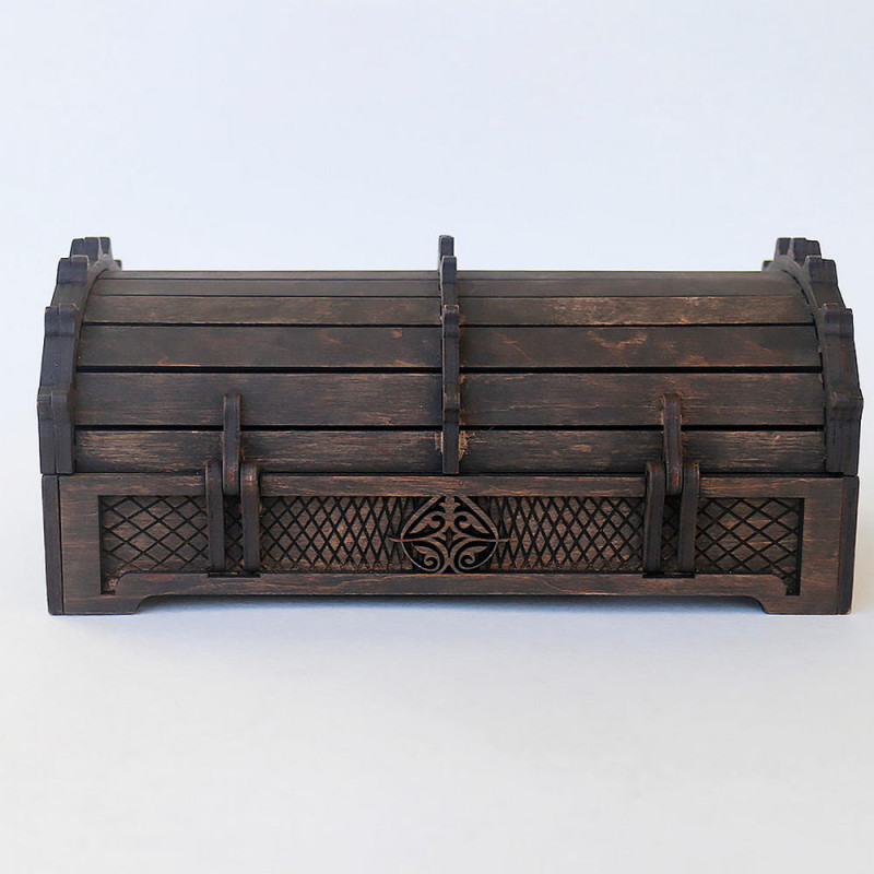 Ексклюзивна скринька ручної роботи “Скарби піратів” — це витвір мистецтва, виготовлений з натурального дерева високої якості. Завдяки ретельному підбору матеріалів і екологічно чистій фарбі темно-коричневого кольору, скринька має стильний і вишуканий зовнішній вигляд, що робить її не тільки декоративним елементом, але й чудовим подарунком для друзів та близьких.