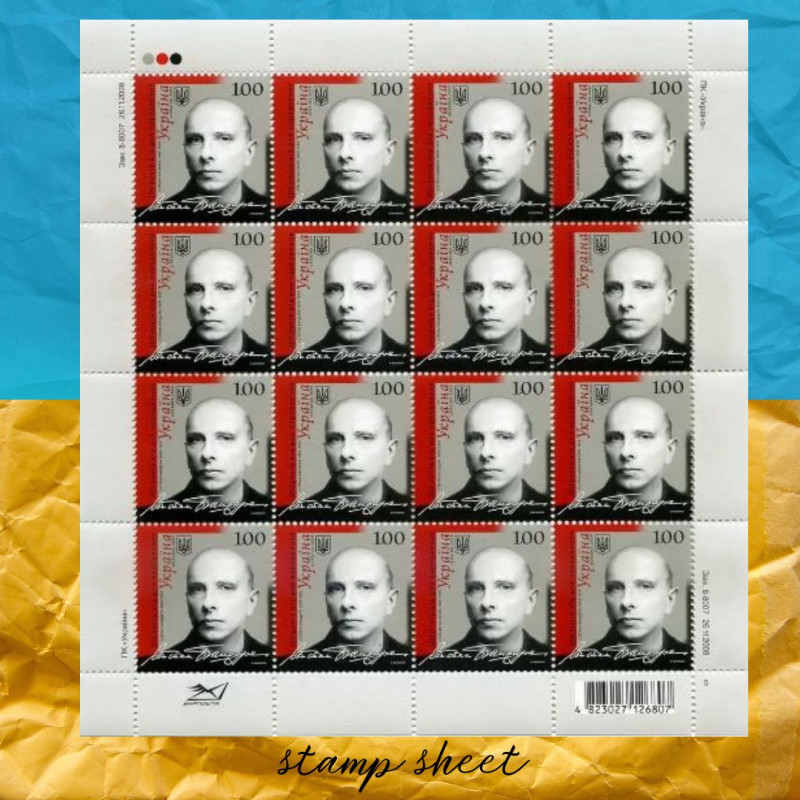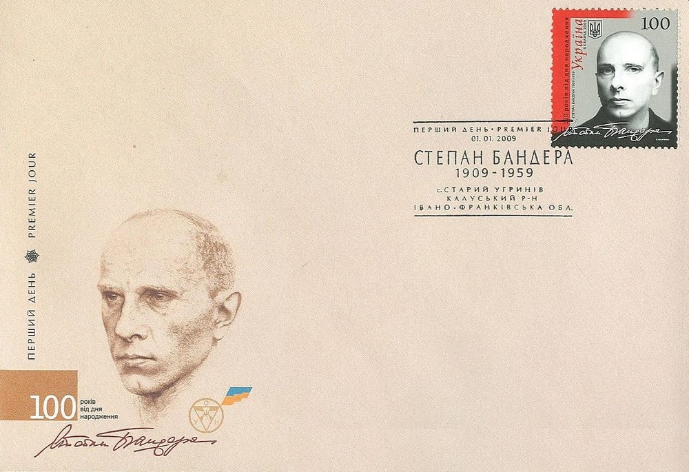 Поштова марка Степан Бандера була запроваджена в обіг Укрпоштою 1 січня 2009 року з нагоди сторіччя від дня народження героя. Марка в чорно- червоних тонах, на якій зображено портрет Степана Бандери. Розмір марки 30 *33 мм. Поштові марки друкувались аркушами 4*4 по 16 штук в листі. Номінал марки 1 грн. Тираж - 220 000 штук. Художник В.С. Василенко.