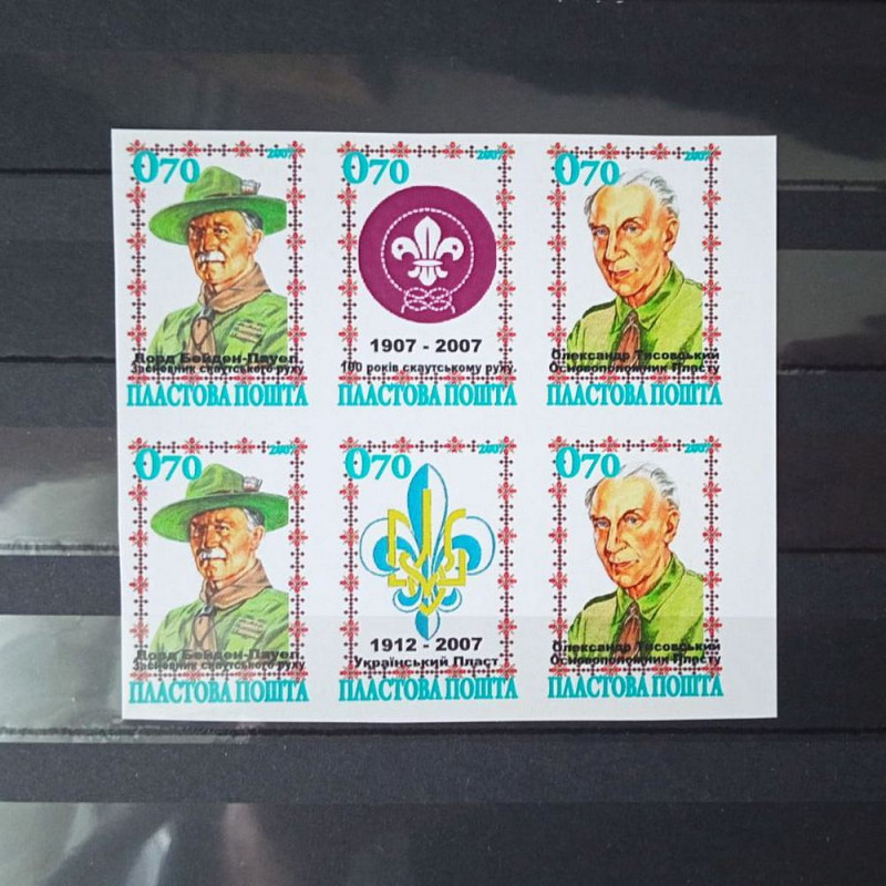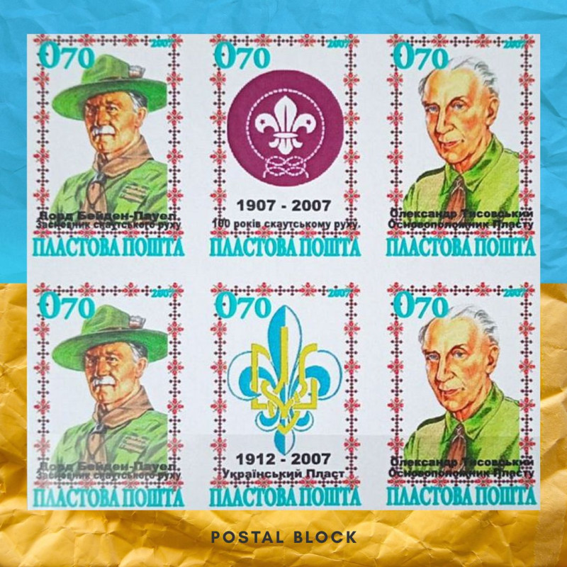 Представлений кольоровий блок марок-віньєток , випущений у 2007 році українським філателістичним товариством «Укрфілкарда», є яскравим вшануванням століття світового скаутського руху — і української гілки, що виросла з його шляхетних ідеалів. Кожна з шести непоштових віньєткових марок у цьому блоці — це окрема шана візії, відвазі та єдності поколінь і народів.