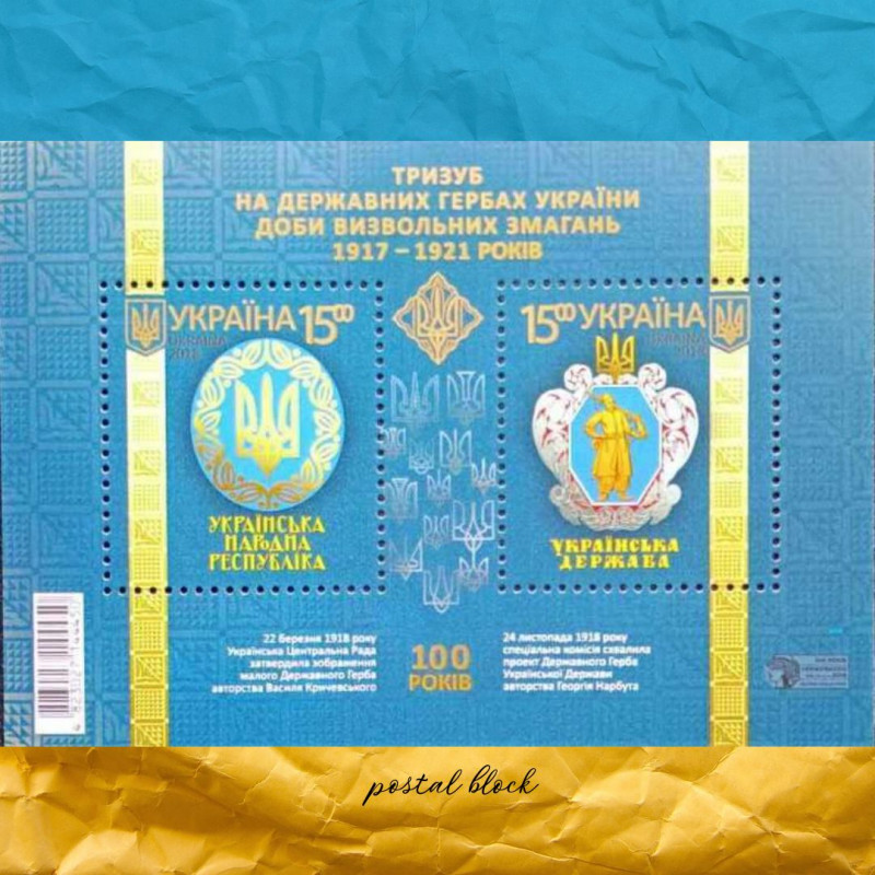 Тризуб - це символ, який займає важливе місце в історії та культурі України. Цей символ з'явився на державному гербі України в добу визвольних змагань та дотепер зберігає свою важливість як символ національної гідності та незалежності. Одним з проявів використання Тризуба на гербі України є випуск поштового блоку 2018 року, присвяченого цьому символу.