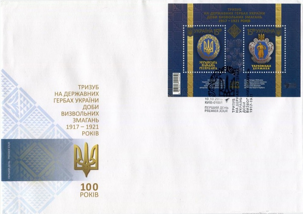 Поштовий блок "Тризуб на державних гербах України" був випущений в Україні в 2018 році. Він складається з двох марок зображень Тризуба. Всі марки мають номінал в 15 гривень та розмір 30,5х35мм. Розмір самого блоку - 100х70мм. Тираж склав 30000 примірників. Блок марок присвячений 100-річчю від часу двох важлиих історичний подій: